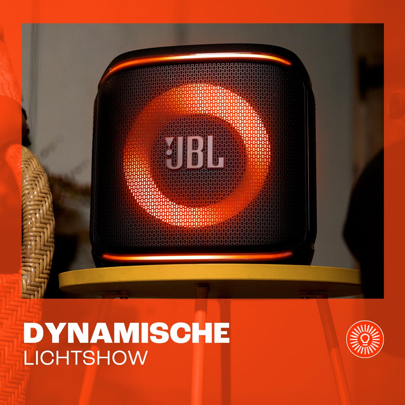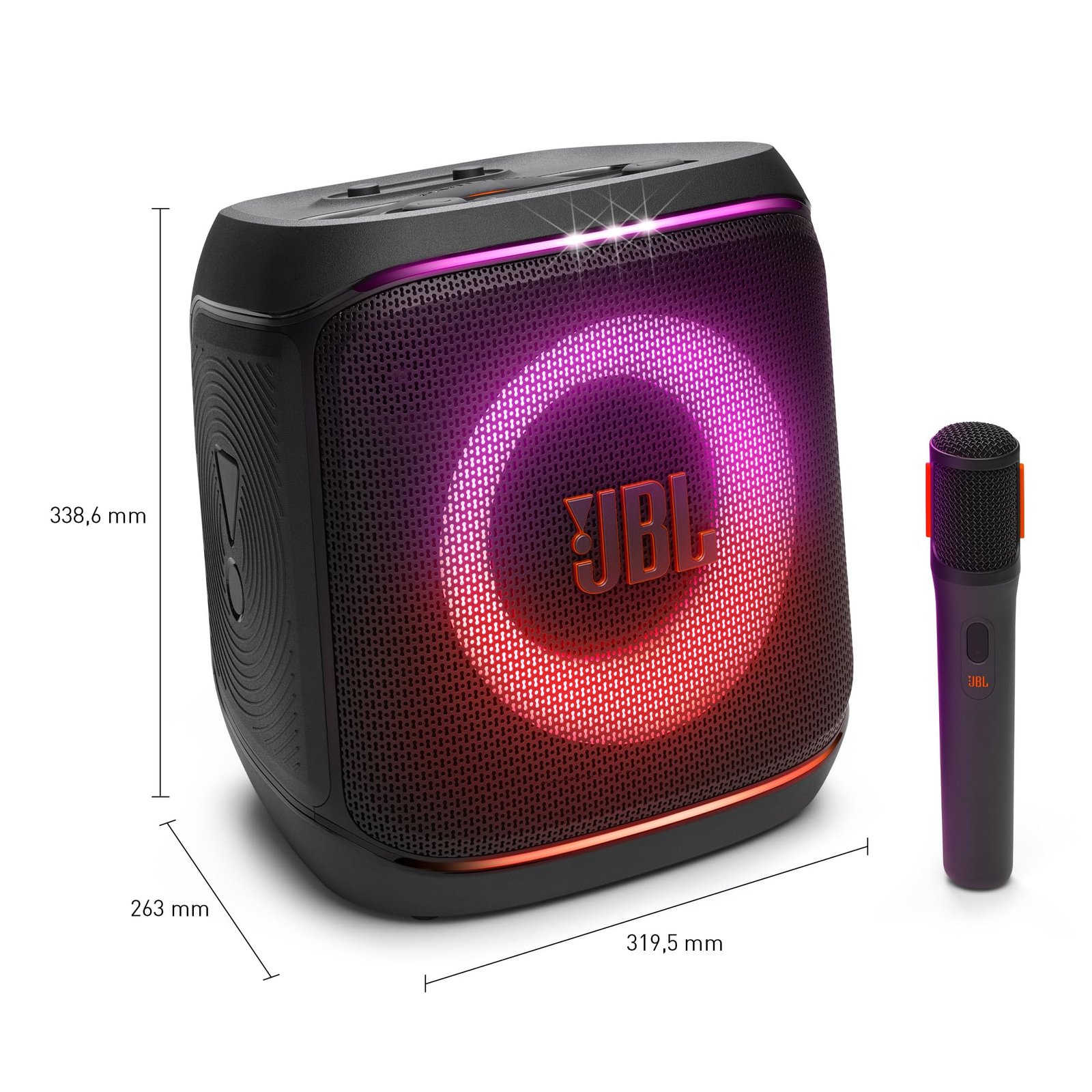 - Licht für jede Stimmung: Strobe-Effekte, dynamische Lichter und ein kabelloses Mikrofon für Karaoke sorgen überall für Partystimmung – alles in einem spritzwassergeschützten IPX4-Design mit praktischem Tragegriff